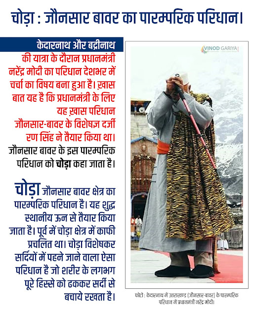 केदारनाथ और बद्रीनाथ की यात्रा के दौरान प्रधानमंत्री नरेंद्र मोदी का परिधान देशभर में चर्चा का विषय बना हुआ है। ख़ास बात यह है कि प्रधानमंत्री के लिए यह ख़ास परिधान जौनसार बावर के विशेषज्ञ दर्जी रण सिंह ने तैयार किया था। जौनसार बावर के इस पारम्परिक परिधान को चोड़ा कहा जाता है।